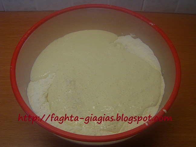 | Βγάζουμε 2 - 3 ώρες νωρίτερα το προζύμι απ' το ψυγείο, γιατί πρέπει να είναι σε θερμοκρασία δωματίου. Σε ένα μπολ, αραιώνουμε το προζύμι με 1 ποτήρι χλιαρό νερό και προσθέτουμε 8 - 9 κουταλιές της σούπας κοσκινισμένο αλεύρι, (μισό - μισό), ώστε να σχηματιστεί ένας χυλός. | |